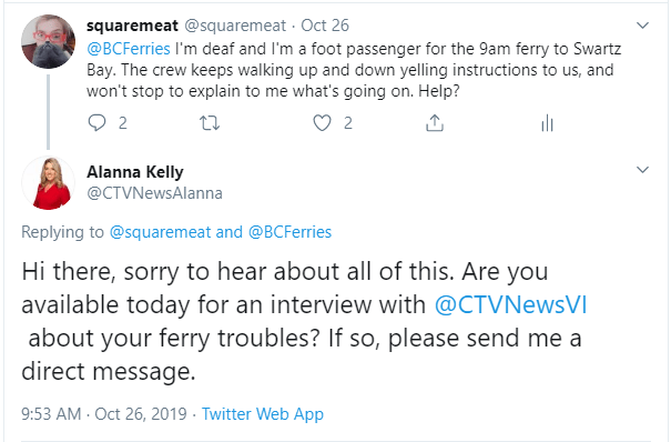 Now, I don’t understand how Alanna Kelly thought interviewing me was going to work without an ASL interpreter, but I would have jumped at the opportunity to remind hearing people that, yes, access to information is important. Not just for them, but for everybody.