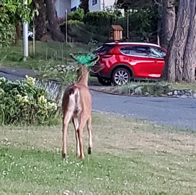 Anyway, sometimes, upon returning home from my various adventures, I have to pass a family of deer snacking on my landlords’ flowers. It happens often enough that it’s not blog-worthy. However, I happened up this buck who’d taken inspiration from Thidwick the Big-Hearted Moose with what I believe to be nylon garden trellis netting wrapped in his antlers.