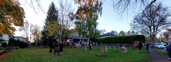 The three of us rode through dry ice mist searching for Halloween displays around Victoria, cautious not to run over tiny vampires and werewolves toting around bags of candy. While neither Maggie nor Davy were impressed by my costume, they were even less impressed by the kid dressed in a pink hoody who ran up to one of the haunted homes we were checking out–thinking Maggie was one of the homeowners–and asked, “Do you like my costume? I’m the colour pink.”
