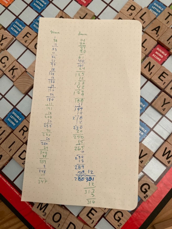 It appears that I’ll have to return for a re-rematch. Or learn a new game that Marianne doesn’t play. Bananagrams? Maybe I should get into arm-wrestling: I’m more brawny than brainy these days.