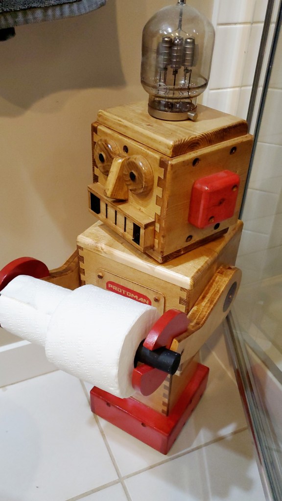 He has a studio downtown where he makes more of these. Mainly, he does screen-printed artwork. Sometimes, wooden robots that serve as toilet paper holders emerge from the studio.
