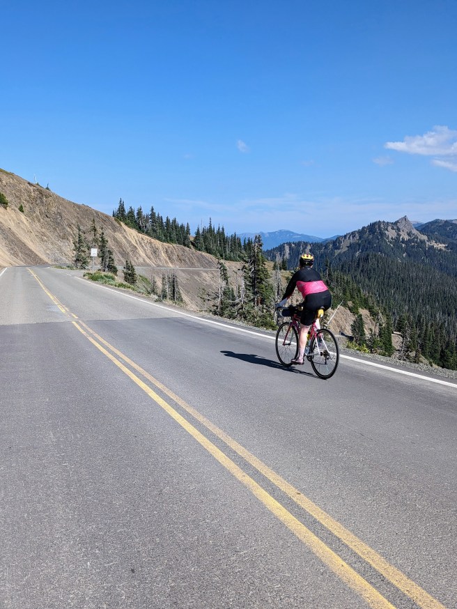 Also, without the heatwave that helped me down Seymour, the Hurricane Ridge descent had my teeth chattering. The ranger station at the top had burnt down in May, which meant there was no access to water at the summit. For this reason, the park rangers were limiting the number of visitors to the top. As Kit and I were riding to the tollbooth, I was horrified to read a portable traffic sign that read HURRICAN RIDGE CLOSED. There wasn’t enough room on the sign for the rest of the message, which was: …TO CARS.