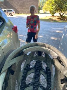 Marianne took one of the best snaps of the day in the parking lot in Maple Falls, before we started our ride. Marianne was missing the foam padding inside the front of her helmet, so she came up with an amusing yet ingenious solution: