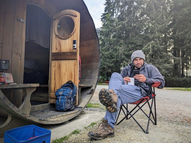 Here is Jordi in Port Renfrew outside the tube we spent three nights in: