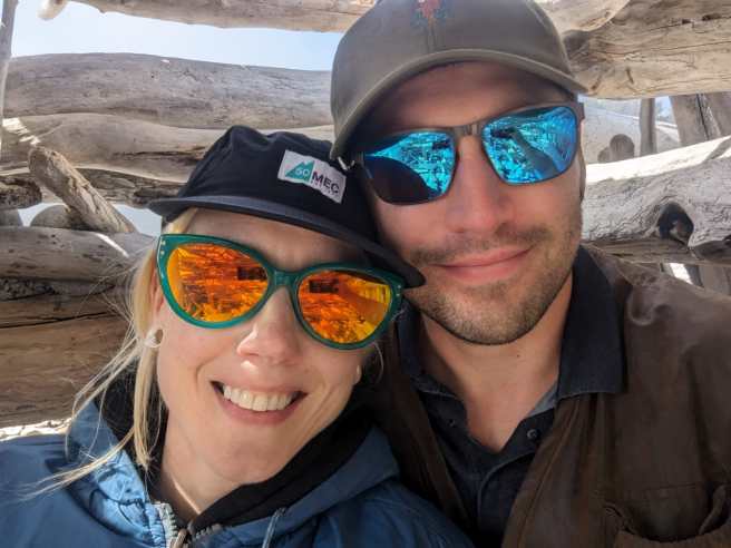 Here’s a still-sober fun-having Jordi inside a driftwood fort that other people made.