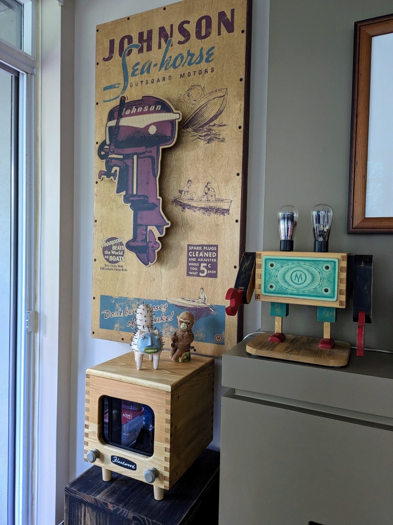 The other ride I did was with my uncle, who is not deaf; however, he is another person I’d let redecorate my place. He does silkscreens of vintage images on wood. A creepy Santa would not look out of place at his home.