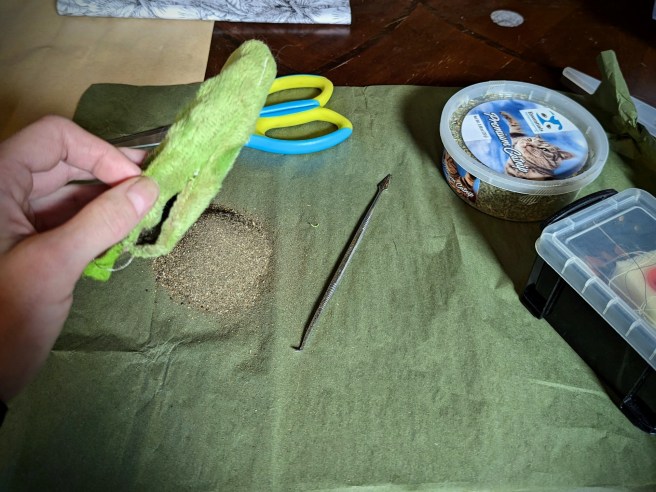 Jordi pointed out how a new pickle cost $5. I can see why anyone would find it excessive to replace just the innards in the interest of keeping the landfills free of an inconsequential cat toy. Now that I go online rather than spend time coating my hands in wax, I’ve learnt how 100 companies are responsible for 71% of global emissions; however, I refuse to subscribe to that “all or nothing” attitude towards sustainability. Doomscrolling is a waste of time. Pickle rejuvenation is not.