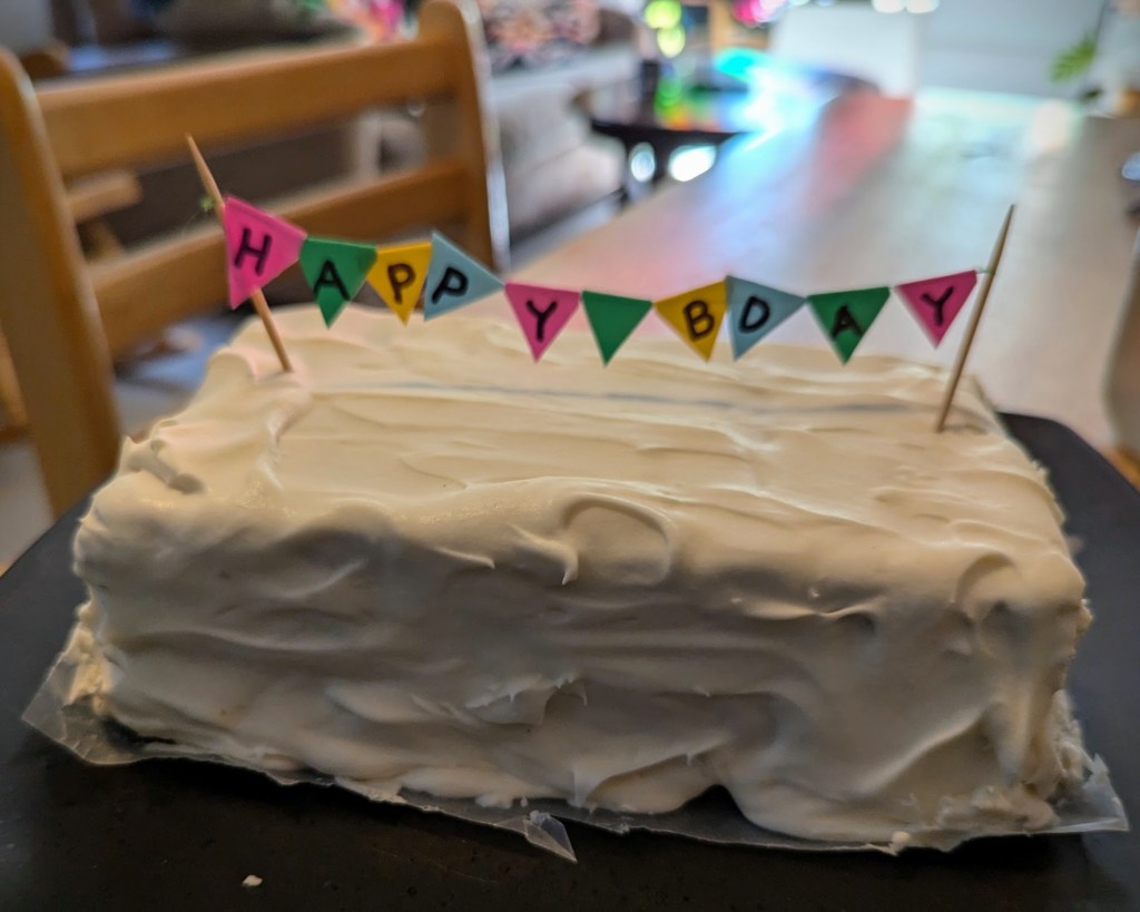 I made a wee pennant banner in the privacy of my bedroom and hung it up with toothpicks. While the roomie was preoccupied with something in his bedroom, I snuck the paper-bagged cake out of the fridge and into my bedroom, where I stabbed it with my last-minute innovation. I thought I could sneak it into the fridge unnoticed, but the roomie was already in the kitchen drinking his coffee. There was no time to fix the lettered pennants.