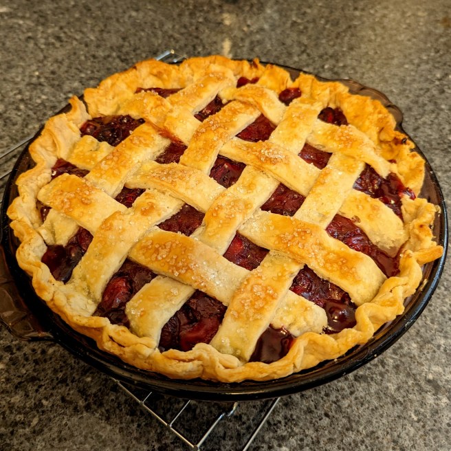 Jordi claimed he preferred the taste of this year’s pie. I used the same recipe but snuck in some Rainier cherries and used more lemon juice.