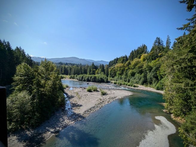 After Jordi’s B-Day came BC Day, which was on the 5th. To celebrate, we ditched BC and headed across the Strait of Juan de Fuca to Port Angeles. This time, it was Jordi’s turn to mingle with my co-workers. Instead of cornholing, we went cycling. The original plan was to catch the 6:10 am ferry to Port Angeles and ride ~40km on the Olympic Adventure Trail to Crescent Lake. It was advertised as a chill ride for riders of varying skill levels. That was probably true for everyone but me. I made it up to the “Living Room” rest stop, where everybody fueled up on snacks. I brought four energy gels and a small insulated bottle containing kabocha squash soup, which I had saved for the lake.