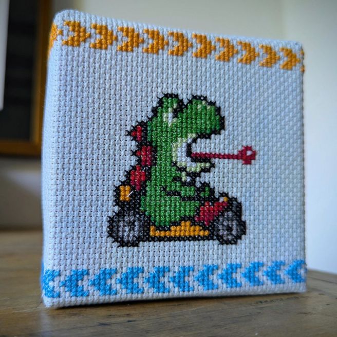 I still find ways to enjoy myself in the basement in which I live. I completed my cross-stitch project by ripping the canvas off its 4″ frame and stapling the cross-stitched Aida cloth in its place.
