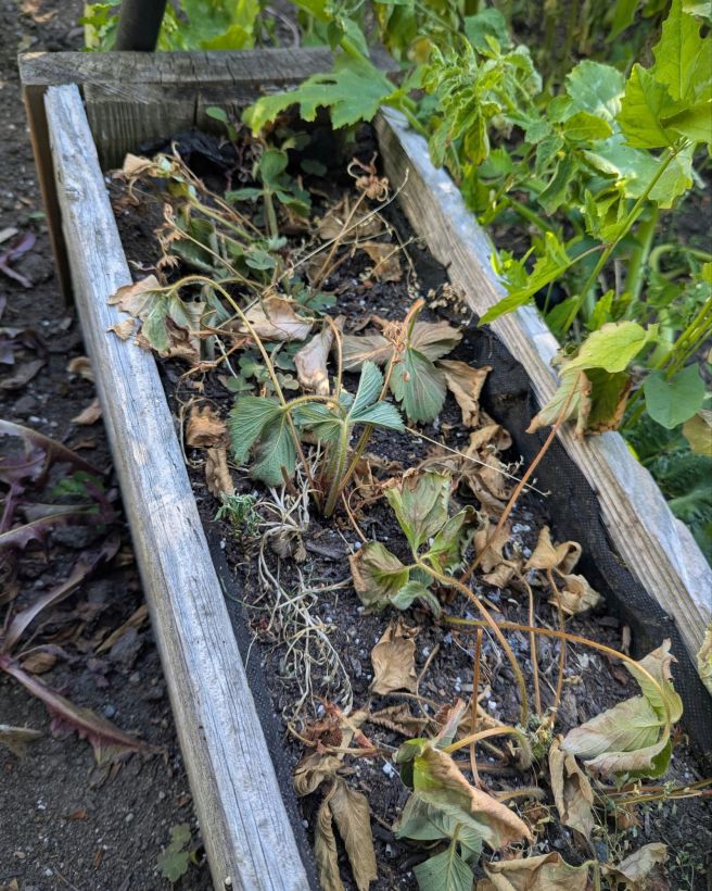 Dead: sugar snap peas, butter lettuce, strawberries, two kale plants and all three nasturtium plants.