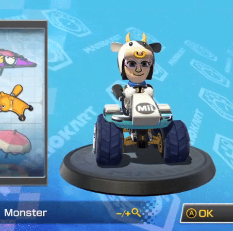 Fall Karting has begun! After playing three rounds earlier tonight, I can confidently say I’m not a confident driver. I’ve switched from using Toad to my Mii. I think the weight class I get put in is dependent on the size of my Mii, so my stats might just be the same as Toad’s. That cow outfit I get to wear is fucking cute though.