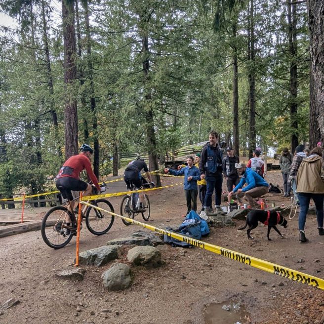 Sunday was a further exercise in socializing. I met up with Matt and Jenna at their place, where I was reunited with a bunch of the beverages Matt and I had purchased earlier in the week. The three of us rode out to Jordie Lunn bike park, where the final CX race of the year was happening, with my new crocheting coach, Mary, as one of the participants. The beverages we’d toted there were to be divided into disposable shot glasses for the racers. We were only mildly diabolical in our beverage selection: nothing was gross, merely surprising.