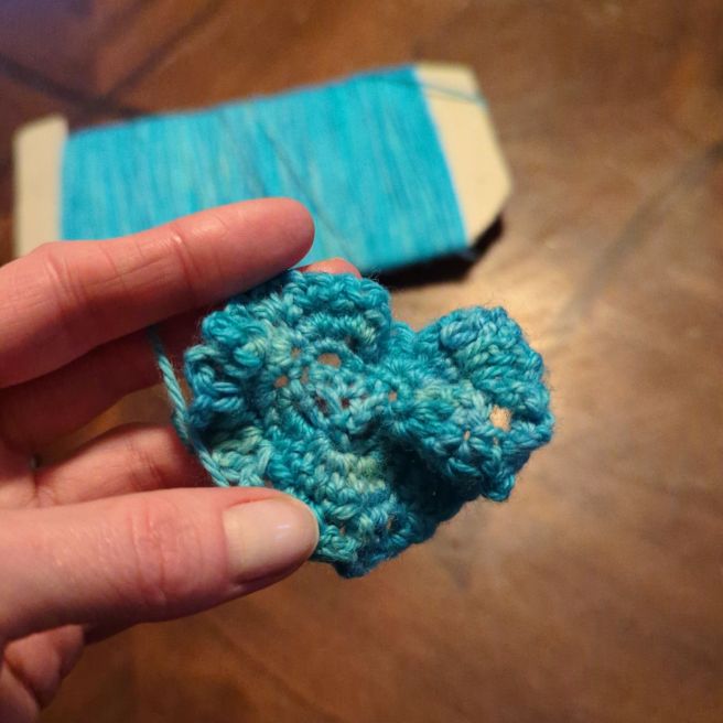 I’m persistent, though. I’ve started on my mushroom toddler. Right now, it looks more like a nipple warmer: