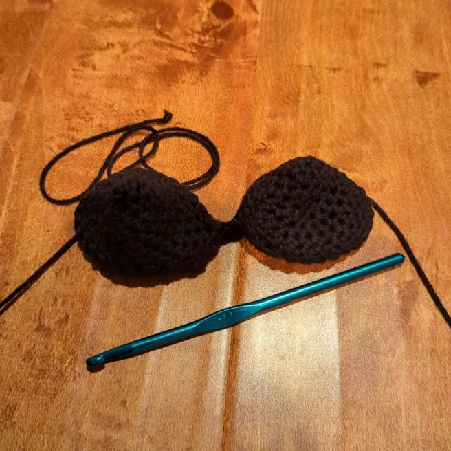…and then it began to deform as I worked up to its belly. All the stitch increases/decreases are happening on one side of the legs, potentially giving the shroom guy a single bow leg. While I await advice from more experienced crocheters, I’ve moved on to the arms.