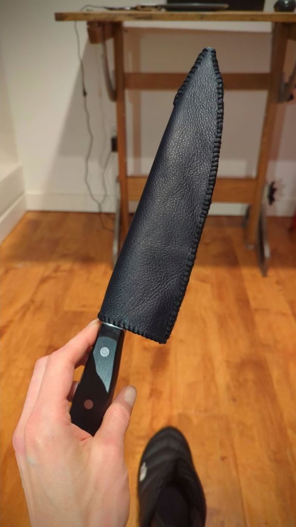 I had scraps of leather and two leather glover’s needle on hand. That’s how craft-ready my crafting cabinet is. I was not ready for how difficult the project would be. Poking a needle, even one specially designed for this application, through leather takes much more effort than through any other fabric I’ve ever worked with. I am satisfied with the end result: it’s the right size and functions as intended. However, I am unsatisfied with the level of satisfaction this project brought me.