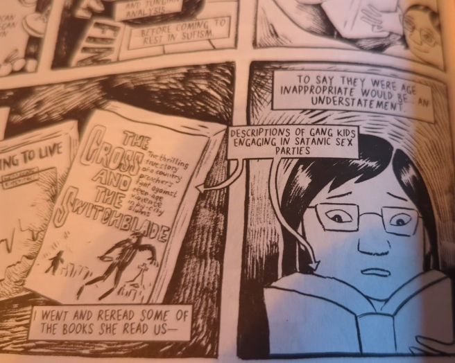 Then again, do I really need another obscure symbol like Orwell’s coral-encased paperweight in 1984 to spoil my bibliophilia for years? Corny symbols aside, panels such as this one conjured warm fuzzy memories of discovering the school library’s collection of VC Andrews novels.