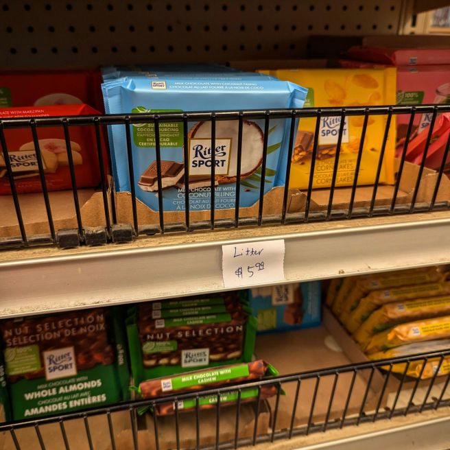 Groceries are already more expensive on Vancouver Island than on the mainland (except for Bubly, for some reason), but the smaller the island, the larger the markup. “Litter” Sport chocolates were going for almost $6 apiece.