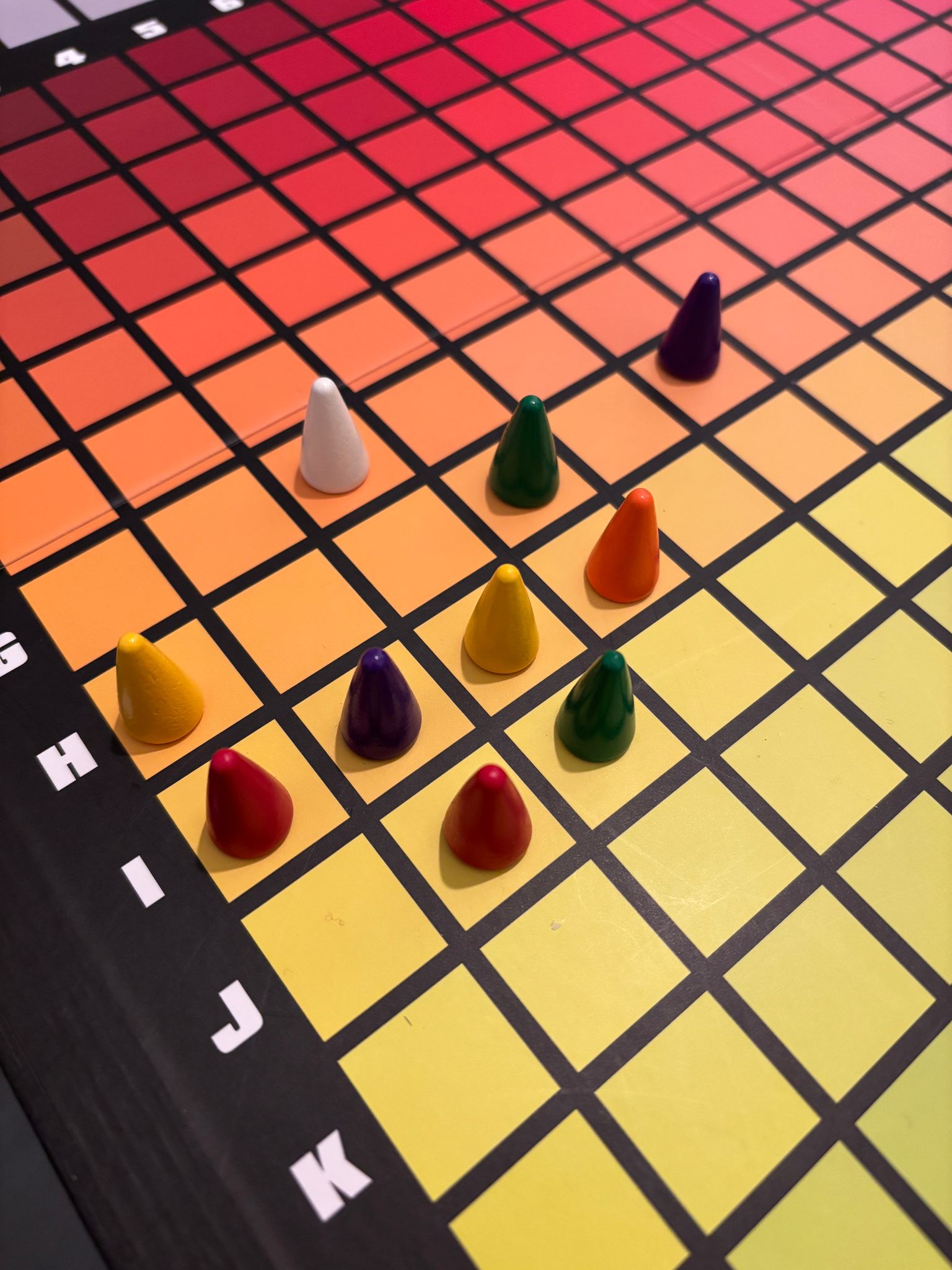 At any rate, I was not off to a good start. My lyrical nyctalopic self did not fare well at this game and this was apparent as my Grimace-coloured cone lagged far behind everyone else the whole time. My final position on the board was DFL. Dead Fucking Last.