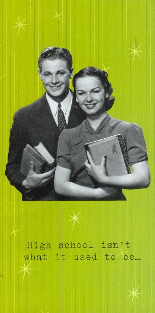 Let me explain why it’s really lame… NONE of the kids in that brochure goes to Welfare School. The kids there don’t even look anything like that! Shit. Besides, what the hell is that kid so happy about? weird. Oh right, he’s prolly happy ’cause he knows he doesn’t have to go there and because he’ll have steamy relations with Big Mouth Billy Bass later, I’ll bet. That girl, she looks like she came out of some tampon ad in a teen mag… Can you see how it says “High school isn’t what it used to be…” then on the inside, it says “IT’S BETTER!”. If you’re already a student at Welfare School, then you know that’s totally bogus! But wait… the lies don’t stop there either! There’s more in the brochure than what I scanned cuz it folds out and it’s like a big assed map, so I couldn’t scan everything. So much lies, ugh.