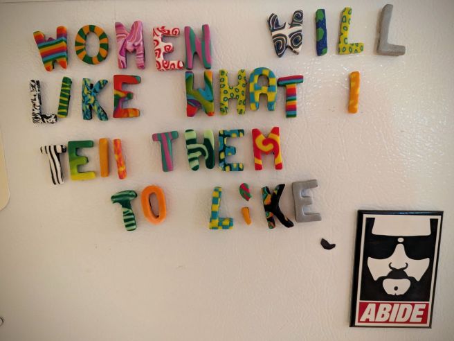 Coincidentally, I’d arranged the alphabet magnets on the fridge to spell out Homer’s sexist quote. I’d done this last Sunday in the spirit of International Women’s Day for the love of irony. It is one of the most over-the-top things Homer has said in the series: I can’t help but laugh at the absurdity of it.